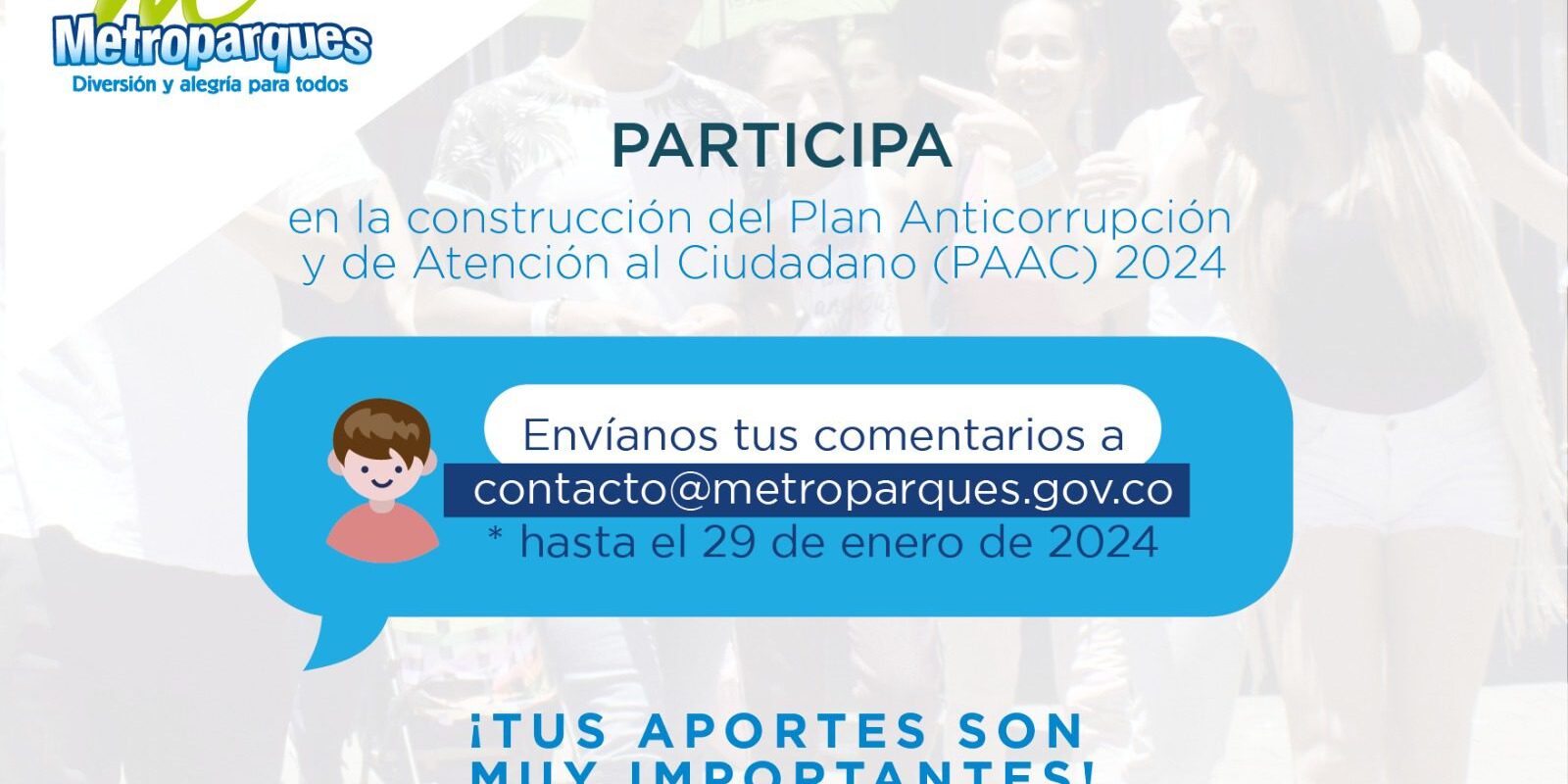 Tus comentarios y propuestas para el Plan Anticorrupción y de Atención al Ciudadano (PAAC) deben ser remitidas hasta el 29 de enero de 2024 al correo electrónico [email protected]